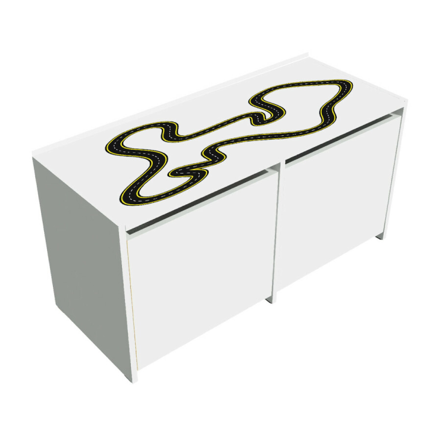 · Op de bovenzijde van de kast is een autobaan geprint.