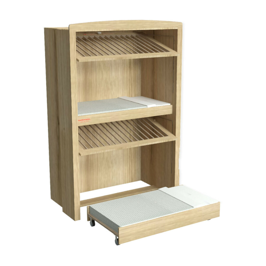 · Het slaapgedeelte onderin heeft een uitrolbare bedlade, waarvan de bodem is voorzien van uitgefreesde ventilatie-sleuven.
