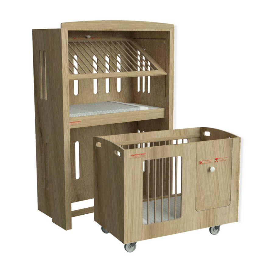 Bed Model BE - E is speciaal ontwikkeld voor de Belgische kinderopvang. Dit Model is voorzien van een losstaand evacuatiebed op rembare wielen. In een noodsituatie dient het Evacuatiebed ervoor om meerdere kinderen in het bedje te plaatsen om de ruimte zo snel mogelijk te verlaten. Het is voorzien van een deur, zodat kinderen onder begeleiding zelfstandig in en uit het bedje kunnen stappen. Het boven bed is voorzien van een raamwerk met een door ons ontworpen uniek schuifsysteem. Het raamwerk blijft in elke stand staan. Het grote voordeel is dat het raamwerk geen vrije val kan maken, dit biedt optimale veiligheid en gebruiksgemak. Het systeem is geluidsarm en ultralicht bedienbaar. Het stapelbed wordt geleverd met sleuven in de achter en zij wanden voor optimale ventilatie. Het dak is voorzien van een plexiglas raam.