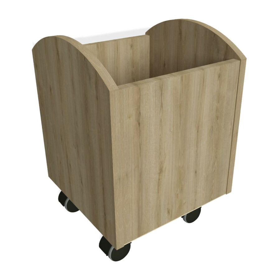 De boeken trolley's zijn vervaardigd uit gemelamineerde plaat in een eiken houtstructuur, geheel rondom afgewerkt met een 1mm pvc kantband in dezelfde kleur. Stootvast en géén scherpe randen. 1 open vakken. Verrijdbaar middels 4 zwenkwielen.