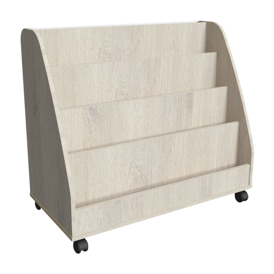 - Verrijdbaar boekenrek met vier presentatievakken aan de voorzijde