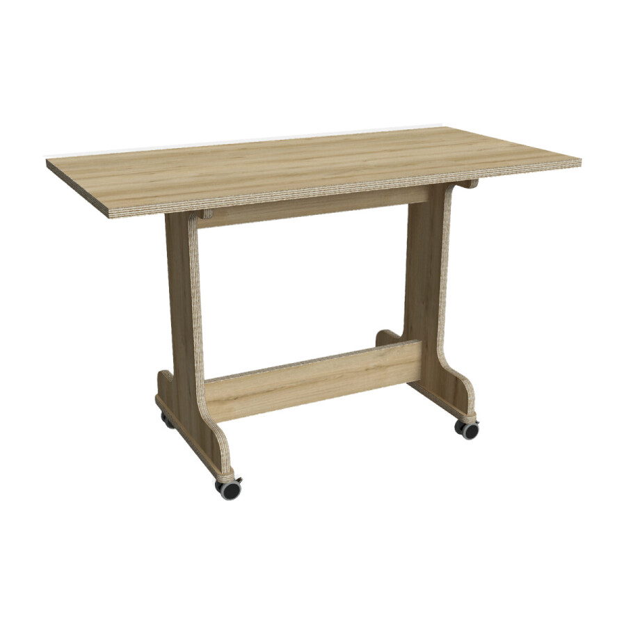 De BSO tafel is vervaardigd uit 22 mm multiplex met HPL, in de uitvoering: eiken.