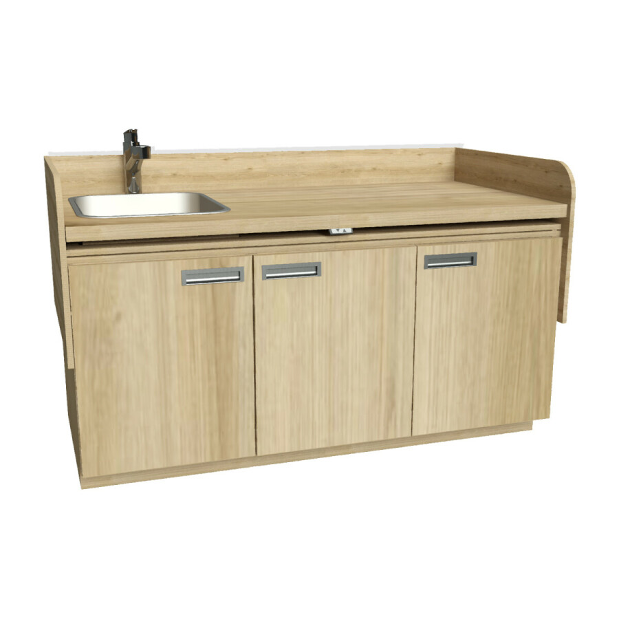 - Om de commode te voorzien van de juiste werkhoogte is het werkblad traploos in hoogte verstelbaar tussen de 80 en 105 cm. Het werkblad is elektrische te verstellen d.m.v. een bedieningspaneel.