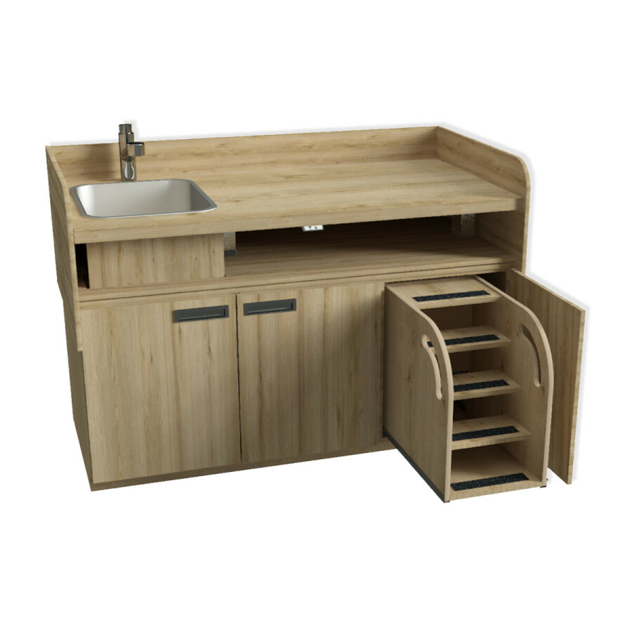- De onderkasten zijn standaard uitgevoerd met draaideuren voorzien van soft-close scharnieren om beklemming te voorkomen. Achter één van deze deurtjes is standaard een veilige vergrendelbare kindertrap met leuning geplaatst. Via deze trap kan het kind “zelfstandig” op de verschoontafel komen.