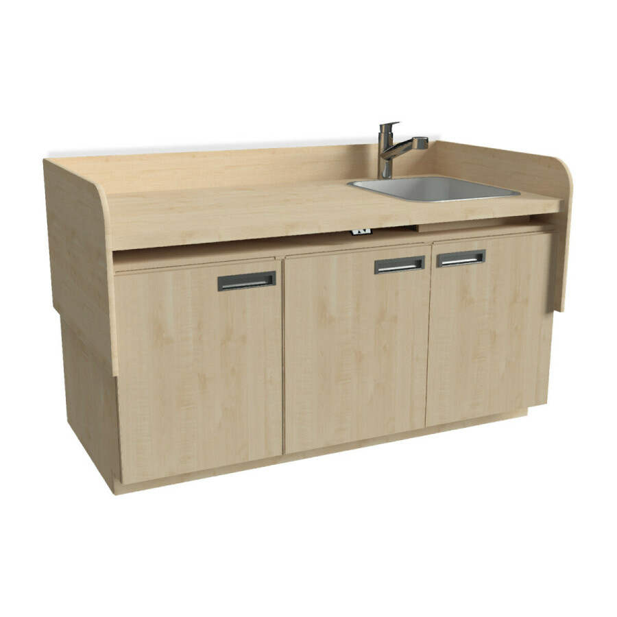 - Om de commode te voorzien van de juiste werkhoogte is het werkblad traploos in hoogte verstelbaar tussen de 80 en 105 cm. Het werkblad is elektrische te verstellen d.m.v. een bedieningspaneel.