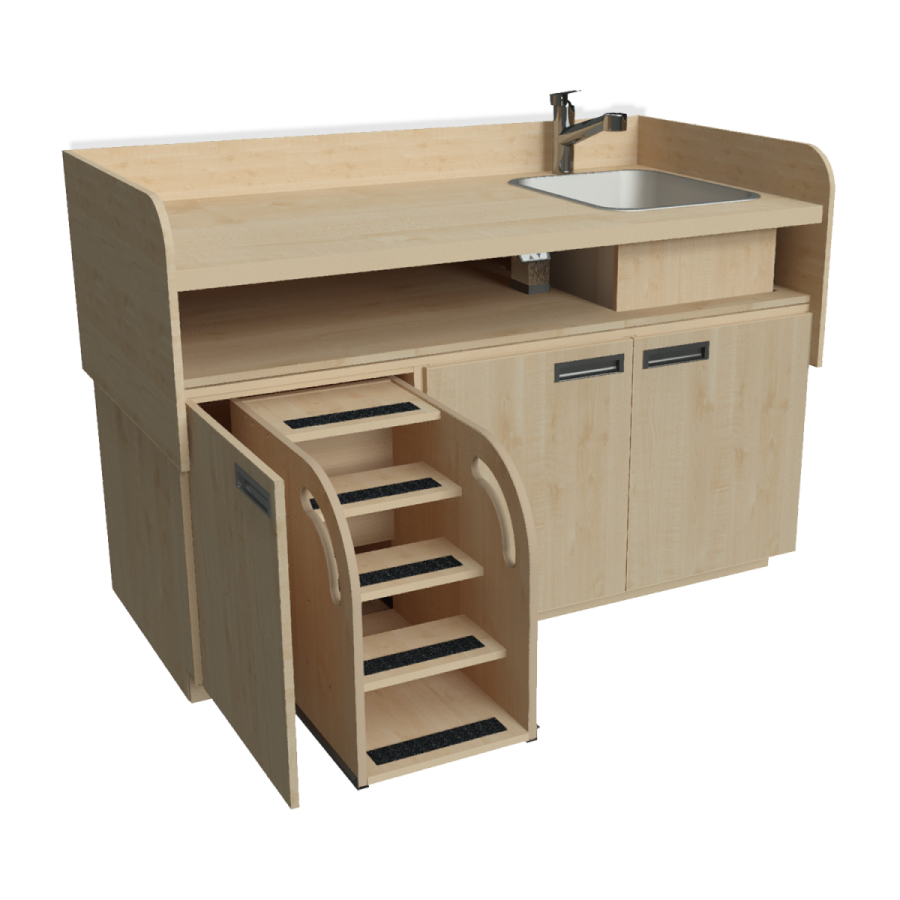 - De onderkasten zijn standaard uitgevoerd met draaideuren voorzien van soft-close scharnieren om beklemming te voorkomen. Achter één van deze deurtjes is standaard een veilige vergrendelbare kindertrap met leuning geplaatst. Via deze trap kan het kind “zelfstandig” op de verschoontafel komen.