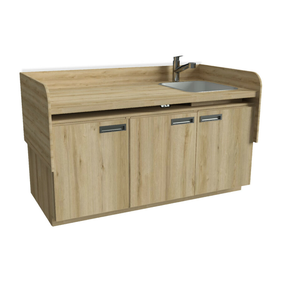 - Om de commode te voorzien van de juiste werkhoogte is het werkblad traploos in hoogte verstelbaar tussen de 80 en 105 cm. Het werkblad is elektrische te verstellen d.m.v. een bedieningspaneel.