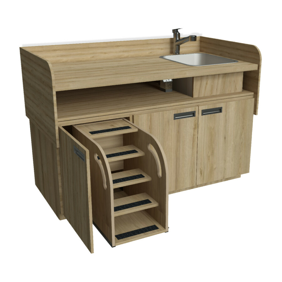 - De onderkasten zijn standaard uitgevoerd met draaideuren voorzien van soft-close scharnieren om beklemming te voorkomen. Achter één van deze deurtjes is standaard een veilige vergrendelbare kindertrap met leuning geplaatst. Via deze trap kan het kind “zelfstandig” op de verschoontafel komen.
