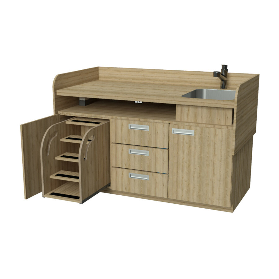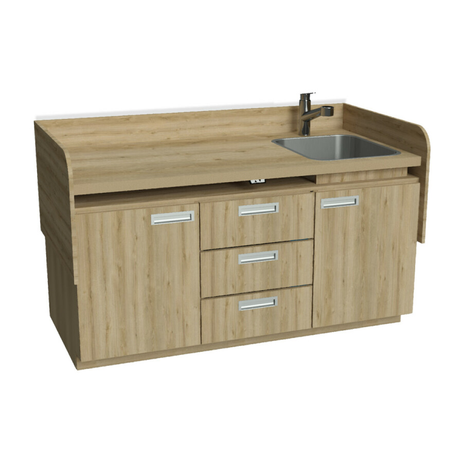 De RVS spoelbak is geplaatst aan de rechterzijde van het werkblad. De trap bevindt zich aan de linkerzijde van de commode. Het sanitair wordt geleverd exclusief de aansluiting voor water en afvoer; de spoelbak wordt geleverd exclusief sifon.
