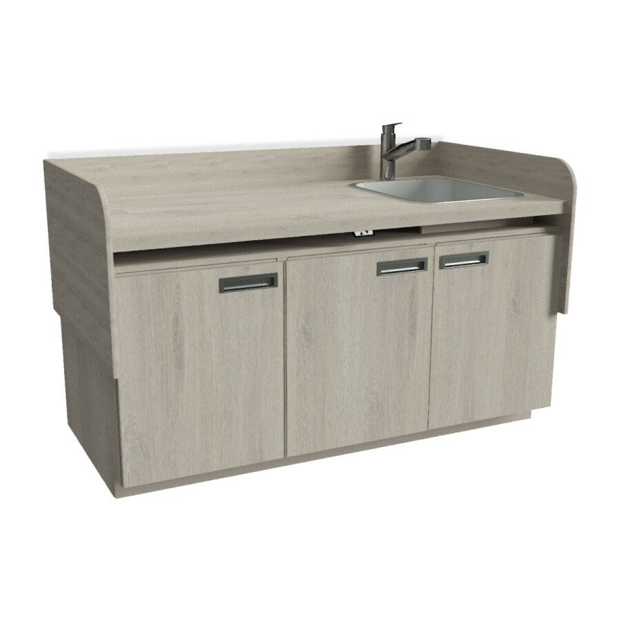 - De commode is uitgerust met een grote roestvrijstalen spoelbak die geheel vlak in het blad is gemonteerd, deze is voorzien van een éénhendel mengkraan met uittrekbare handdouche; uit te breiden met thermische beveiliging om gelijk de juiste temperatuur te verkrijgen.