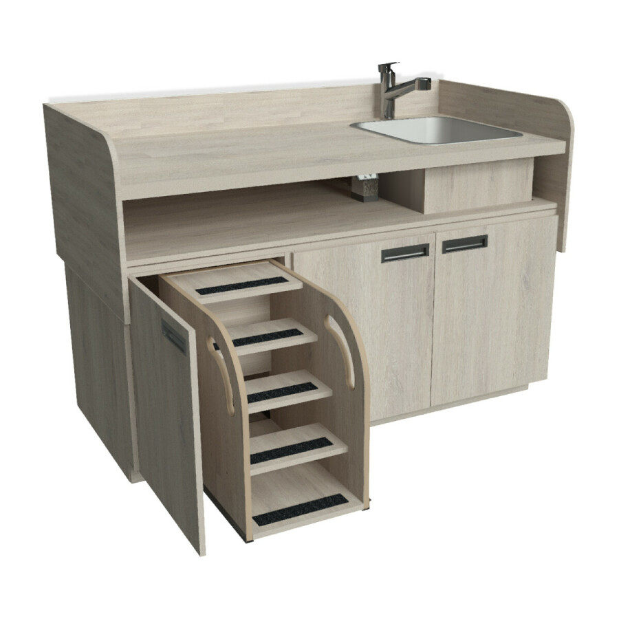 - De onderkasten zijn standaard uitgevoerd met draaideuren voorzien van soft-close scharnieren om beklemming te voorkomen. Achter één van deze deurtjes is standaard een veilige vergrendelbare kindertrap met leuning geplaatst. Via deze trap kan het kind “zelfstandig” op de verschoontafel komen.
