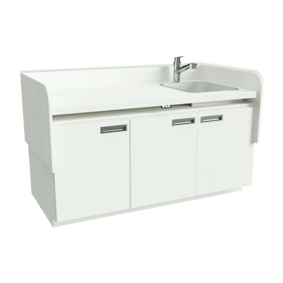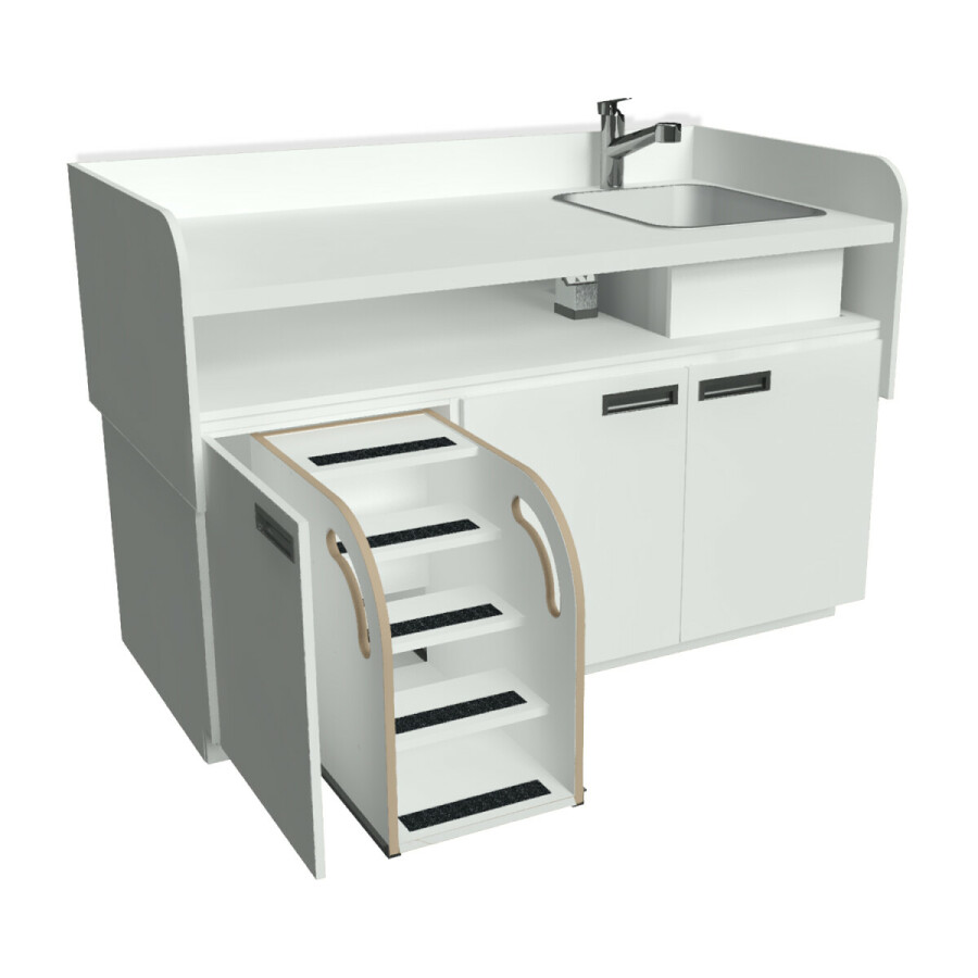 - De onderkasten zijn standaard uitgevoerd met draaideuren voorzien van soft-close scharnieren om beklemming te voorkomen. Achter één van deze deurtjes is standaard een veilige vergrendelbare kindertrap met leuning geplaatst. Via deze trap kan het kind “zelfstandig” op de verschoontafel komen.