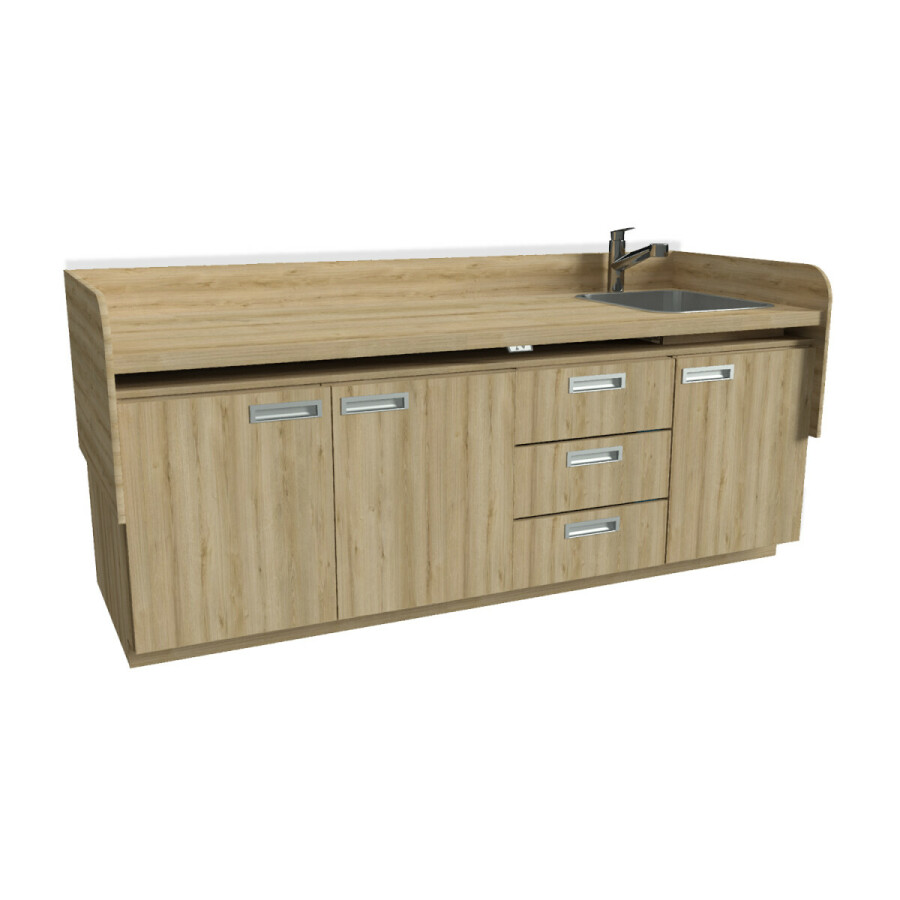 De RVS spoelbak is geplaatst aan de rechterzijde van het werkblad. De trap, lade en legplank bevinden zich aan de linkerzijde van de commode. Het sanitair wordt geleverd exclusief de aansluiting voor water en afvoer; de spoelbak wordt geleverd exclusief sifon.