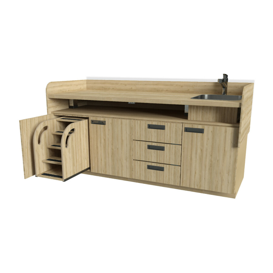 · Achter het eerste deurtje aan de linkerzijde is standaard een veilige vergrendelbare kindertrap met leuning geplaatst. Via deze trap kan het kind “zelfstandig” op de verschoontafel komen.