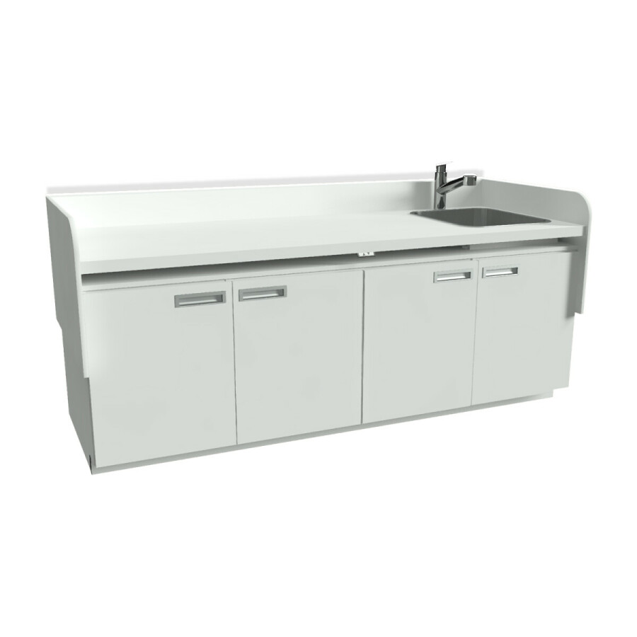 - De commode is uitgerust met een grote roestvrijstalen spoelbak die geheel vlak in het blad is gemonteerd, deze is voorzien van een éénhendel mengkraan met uittrekbare handdouche; uit te breiden met thermische beveiliging om gelijk de juiste temperatuur te verkrijgen.
