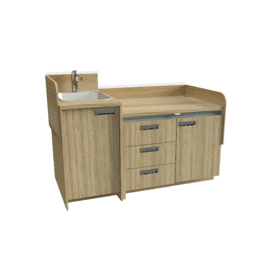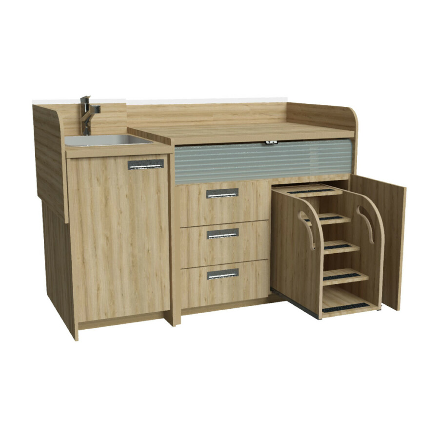 De spoelbak en kraan zijn geplaatst aan de linkerzijde van het werkblad. De trap bevindt zich aan de rechterzijde van de commode.