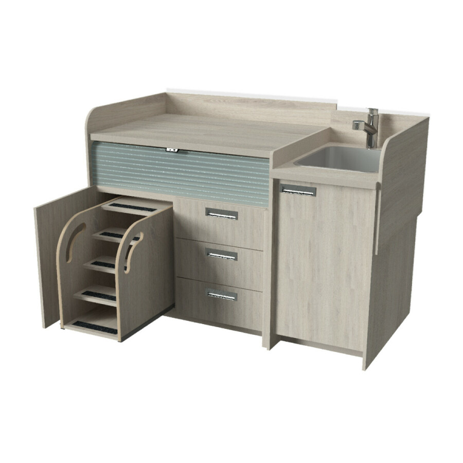 Achter de linkerdeur is een veilige, vergrendelbare kindertrap met leuning geplaatst. Hiermee kan het kind zelfstandig en veilig op de verschoontafel klimmen.