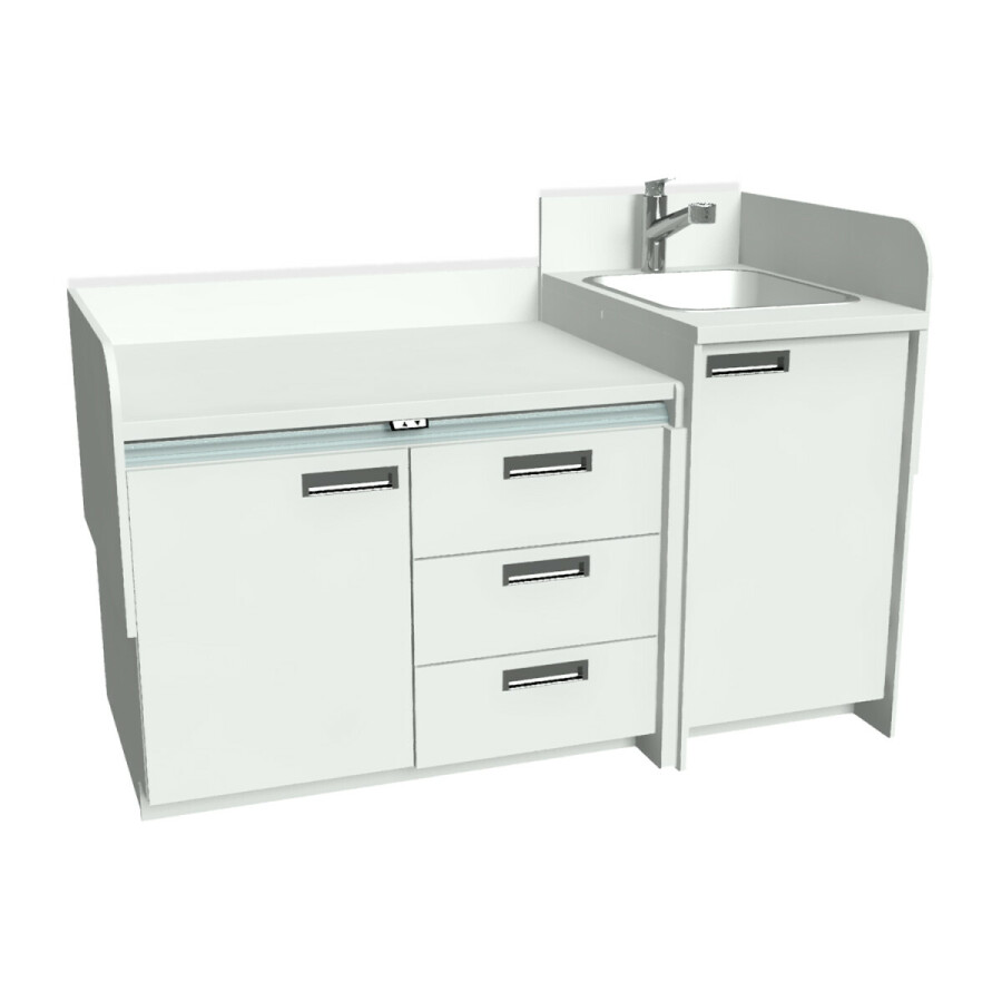 De commode is afgewerkt met een aluminium rolluik tussen het werkblad en de kasten.