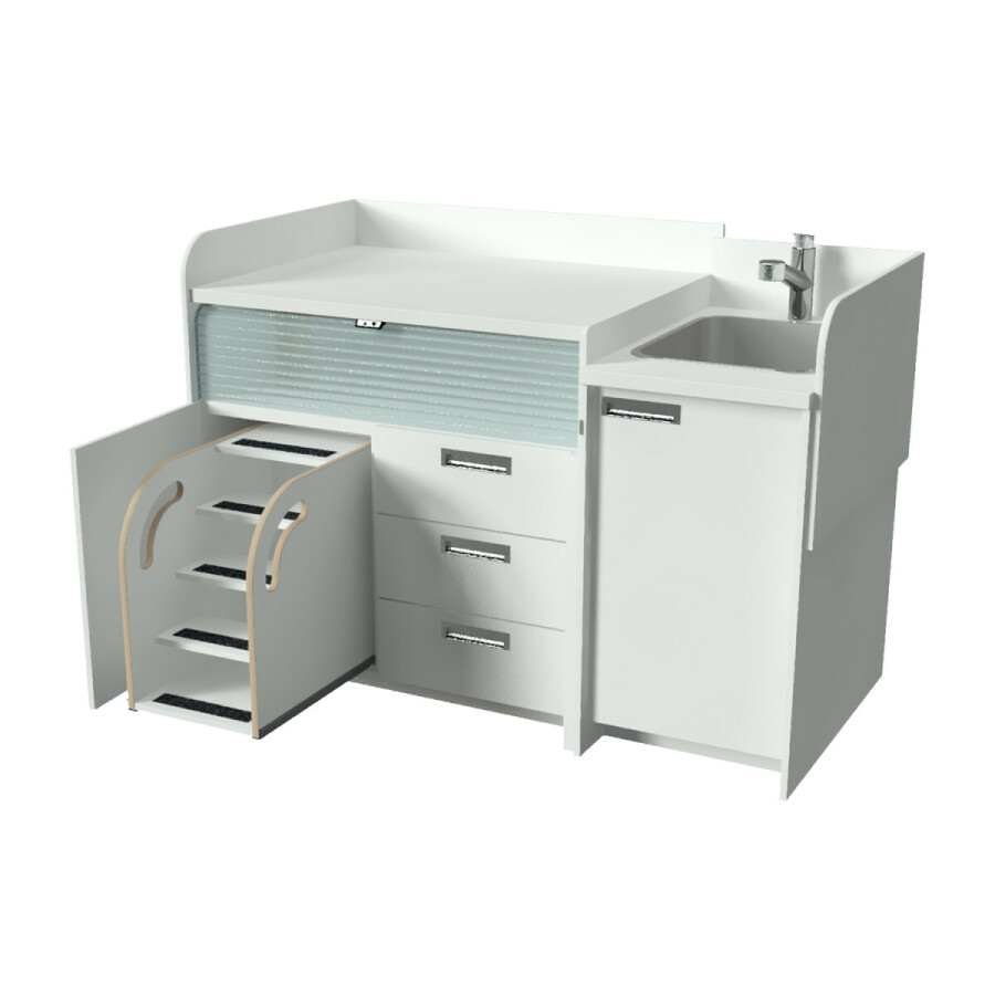 Achter de linkerdeur is een veilige, vergrendelbare kindertrap met leuning geplaatst. Hiermee kan het kind zelfstandig en veilig op de verschoontafel klimmen.