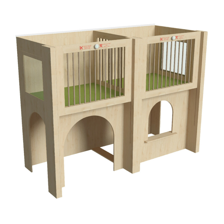 · De kinderen liggen gescheiden van elkaar in de box. Door een spijlen tussenwandje kunnen ze evengoed met elkaar contact maken.