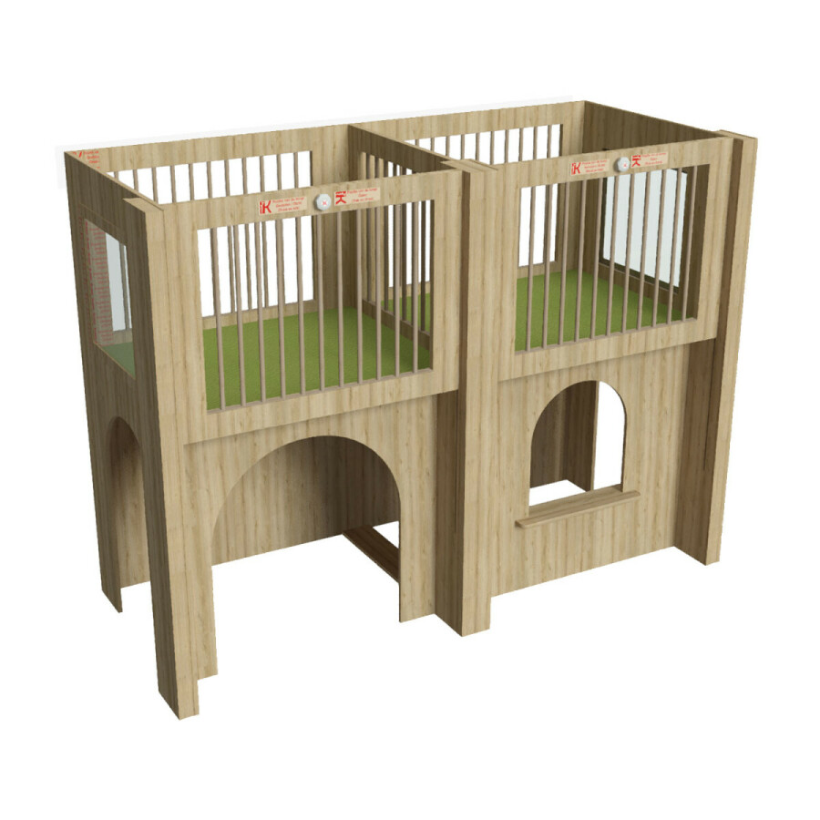 · De kinderen liggen gescheiden van elkaar in de box. Door een spijlen tussenwandje kunnen ze evengoed met elkaar contact maken.