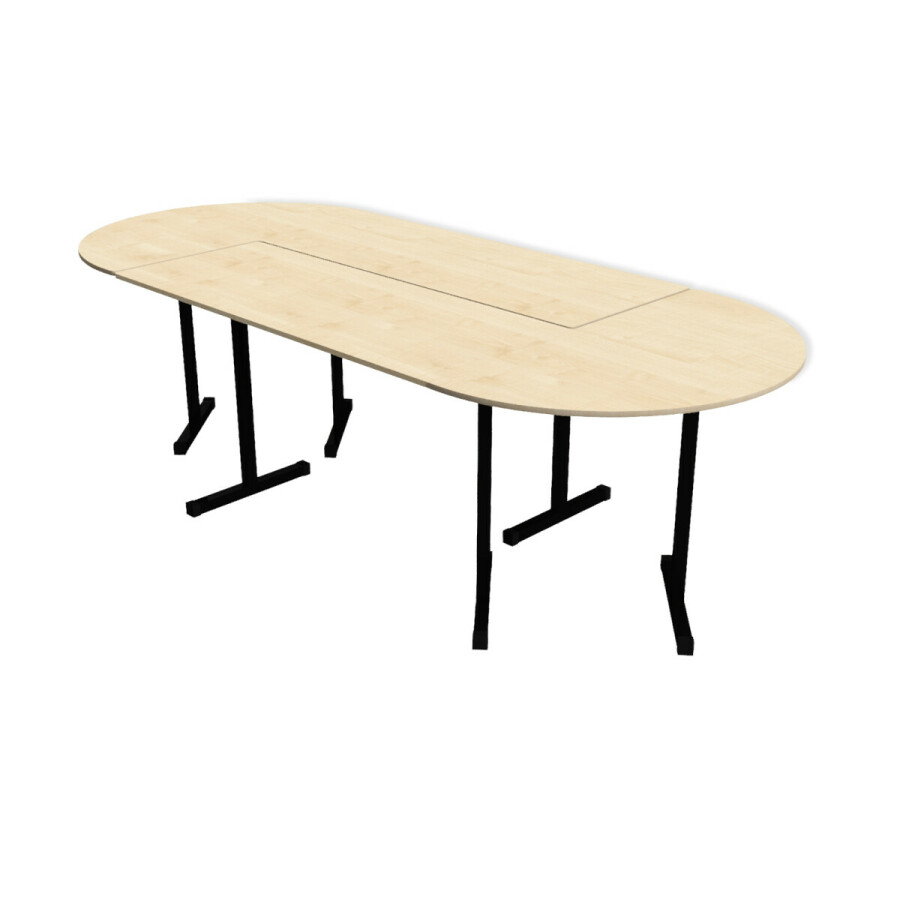 · De tafels hebben een L-vorm met ronde kopkanten waardoor deze mooi in elkaar passen en een ovaal vormen.