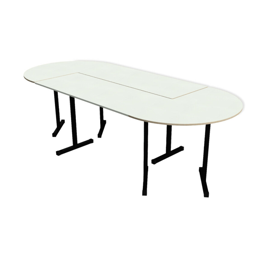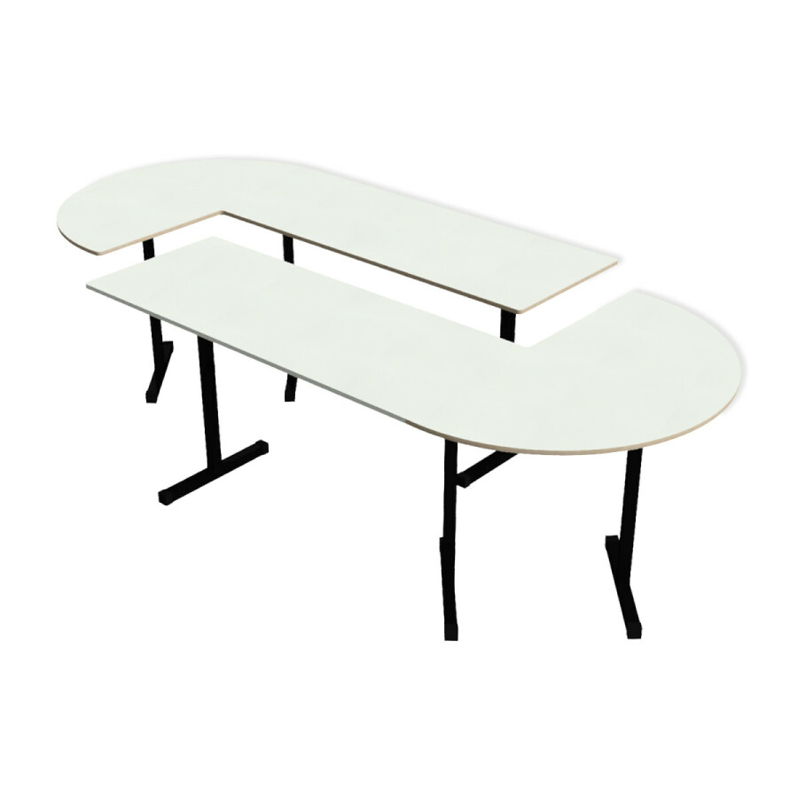 · De tafels hebben een L-vorm met ronde kopkanten waardoor deze mooi in elkaar passen en een ovaal vormen.