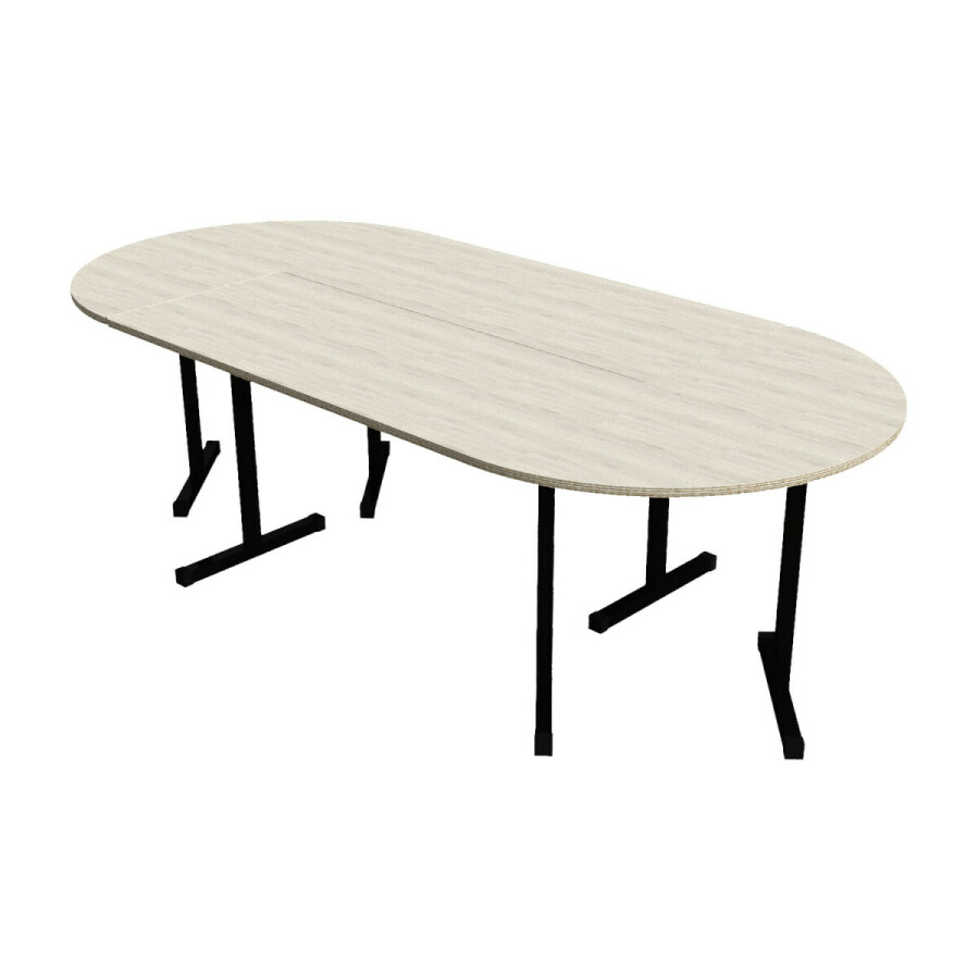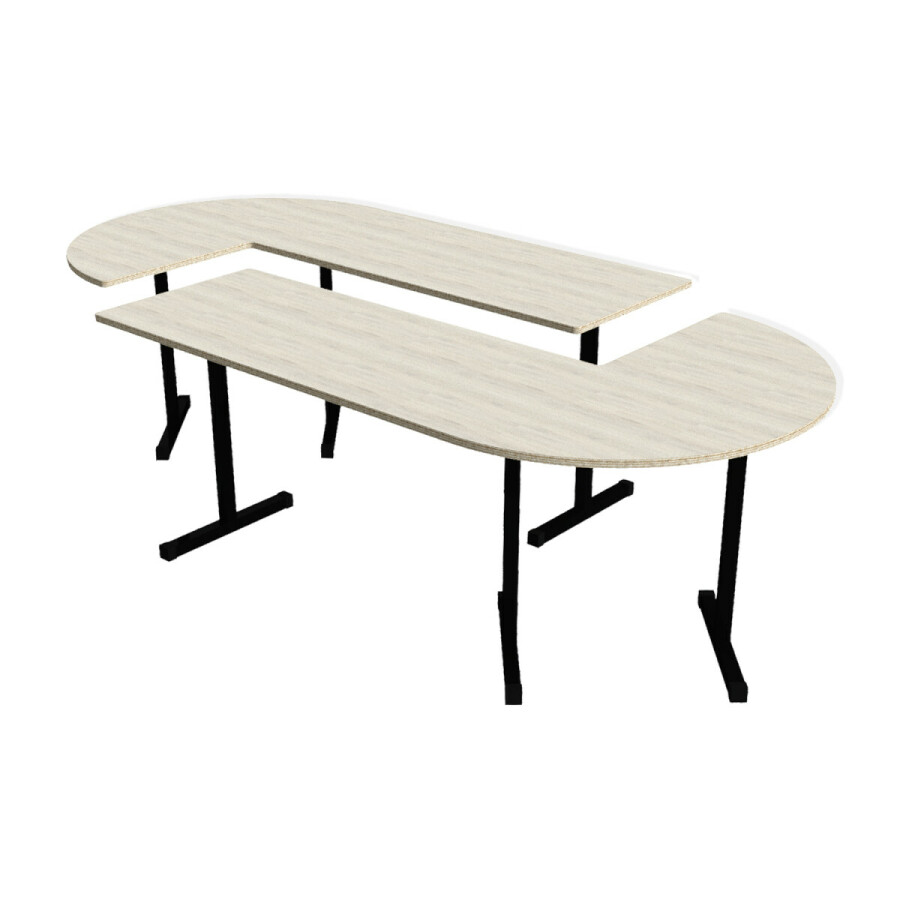 · De tafels hebben een L-vorm met ronde kopkanten waardoor deze mooi in elkaar passen en een ovaal vormen.