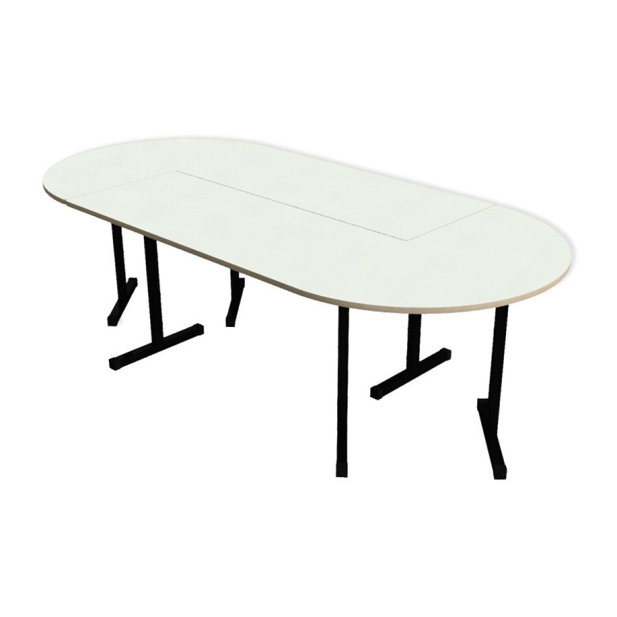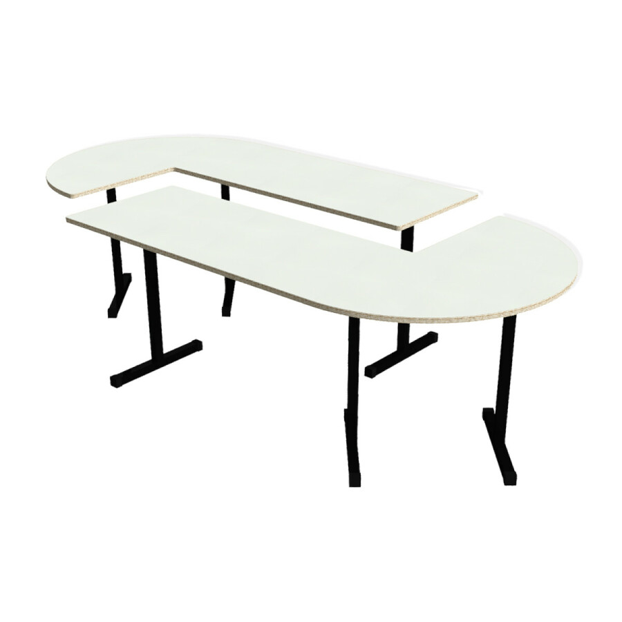 · De tafels hebben een L-vorm met ronde kopkanten waardoor deze mooi in elkaar passen en een ovaal vormen.