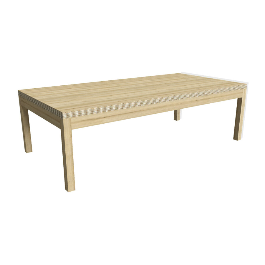 De Lage Groepstafel is vervaardigd van een massief eiken onderstel met een 32 mm dik multiplex blad afgewerkt met HPL. Standaard uitgevoerd in: eiken. De kopse kanten van het blad zijn blank gelakt, het onderstel is in de gekozen kleur gelakt.