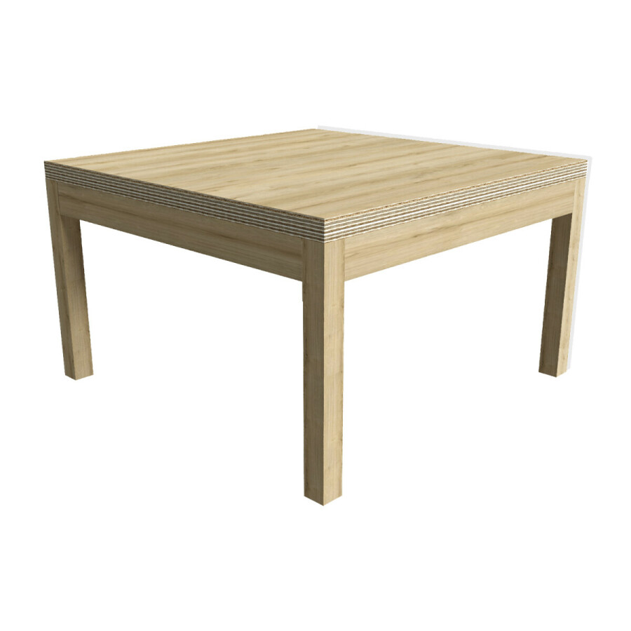 De Lage Groepstafel is vervaardigd van een massief eiken onderstel met een 32 mm dik multiplex blad afgewerkt met HPL. Standaard uitgevoerd in: eiken. De kopse kanten van het blad zijn blank gelakt, het onderstel is in de gekozen kleur gelakt.