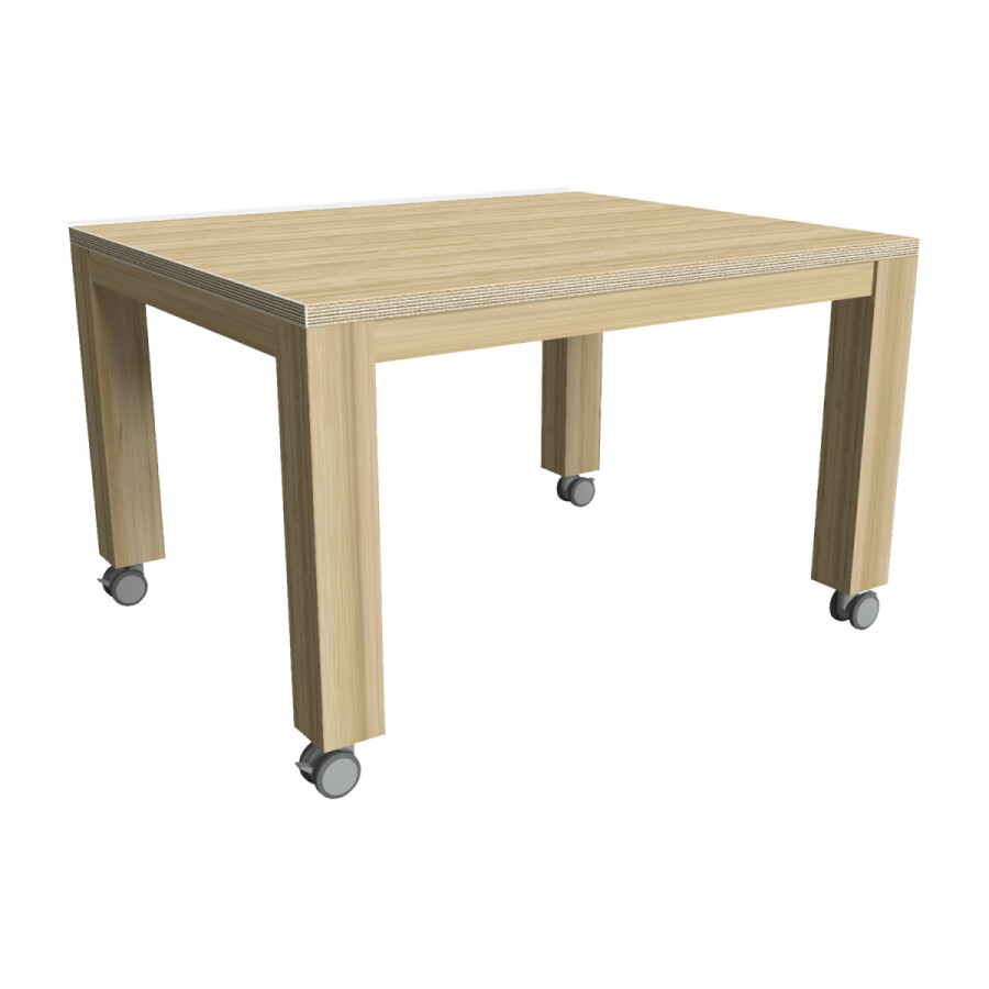 De Groepstafel met wielen is vervaardigd van een massief eiken onderstel met een 32 mm dik multiplex blad afgewerkt met HPL. Kleur: eiken. De kopse kanten van het blad zijn blank gelakt, het onderstel is in de gekozen kleur gelakt.