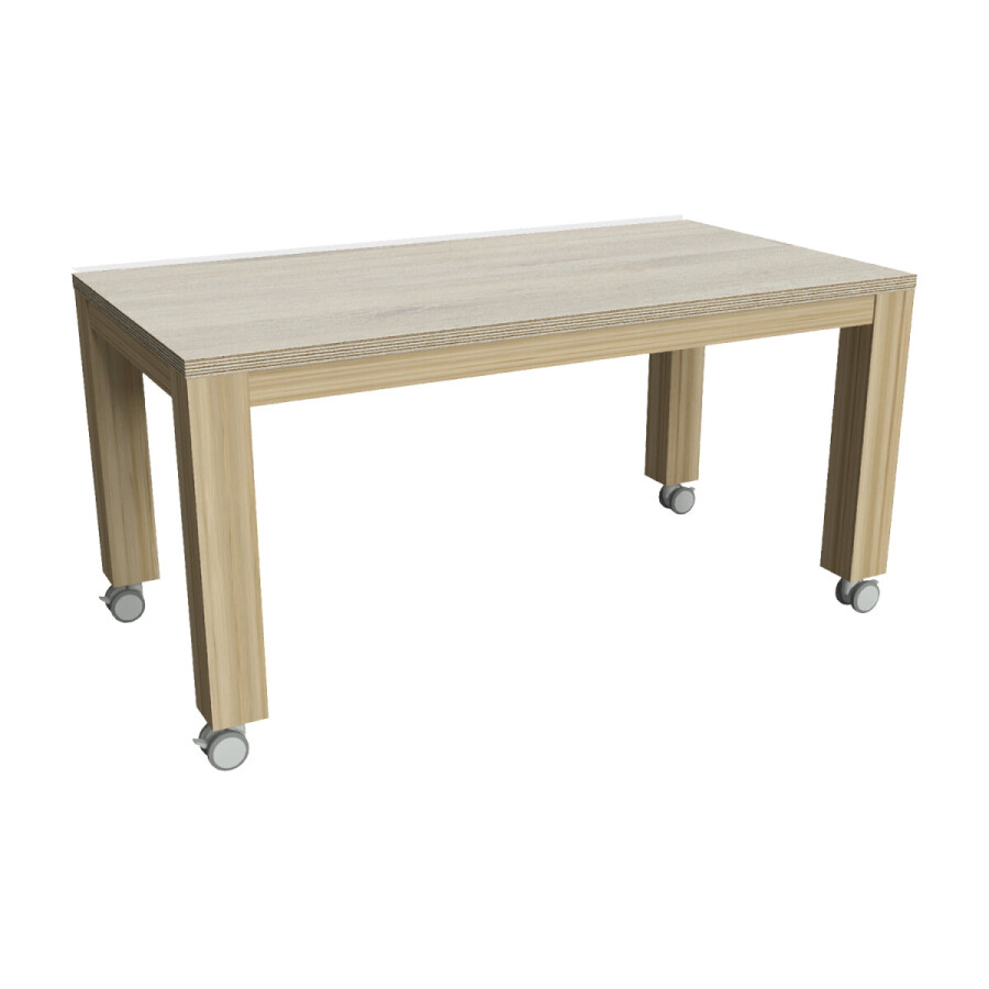 De Groepstafel met wielen is vervaardigd van een massief eiken onderstel met een 32 mm dik multiplex blad afgewerkt met HPL. Kleur: white wash. De kopse kanten van het blad zijn blank gelakt, het onderstel is in de gekozen kleur gelakt.