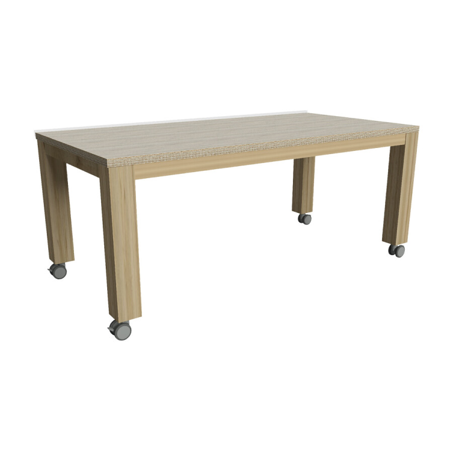 De Groepstafel met wielen is vervaardigd van een massief eiken onderstel met een 32 mm dik multiplex blad afgewerkt met HPL. Kleur: white wash. De kopse kanten van het blad zijn blank gelakt, het onderstel is in de gekozen kleur gelakt.