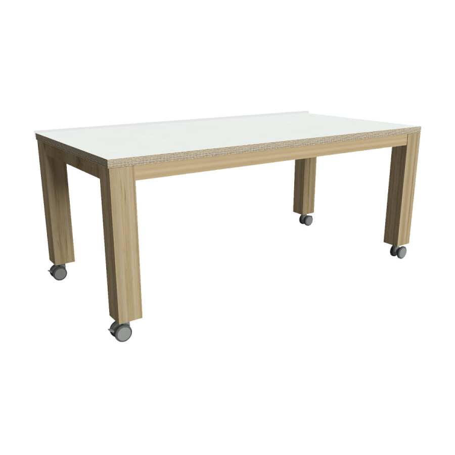 De Groepstafel met wielen is vervaardigd van een massief eiken onderstel met een 32 mm dik multiplex blad afgewerkt met HPL. Kleur: wit. De kopse kanten van het blad zijn blank gelakt, het onderstel is in de gekozen kleur gelakt.