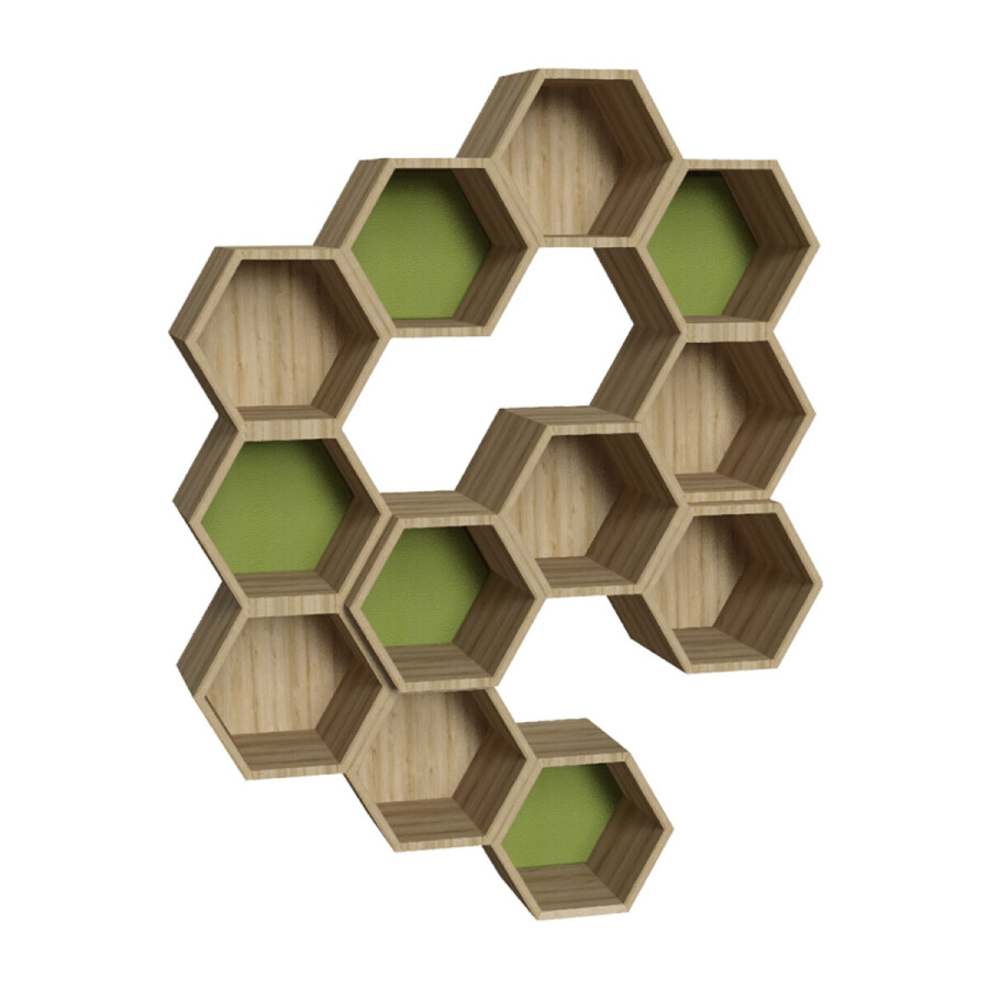 Een decoratieve hangkast, de Honingraat kast. Door de 6-hoekigekasten, welke aan een geschakeld zijn, wordt het een speelse kast. Door de hoogte verschillen wordt er een diepte gecreëerd, welke een leuk effect aan wordt gegeven aan de kast.