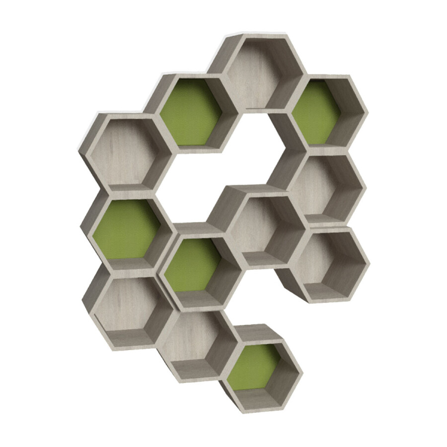 Een decoratieve hangkast, de Honingraat kast. Door de 6-hoekigekasten, welke aan een geschakeld zijn, wordt het een speelse kast. Door de hoogte verschillen wordt er een diepte gecreëerd, welke een leuk effect aan wordt gegeven aan de kast.