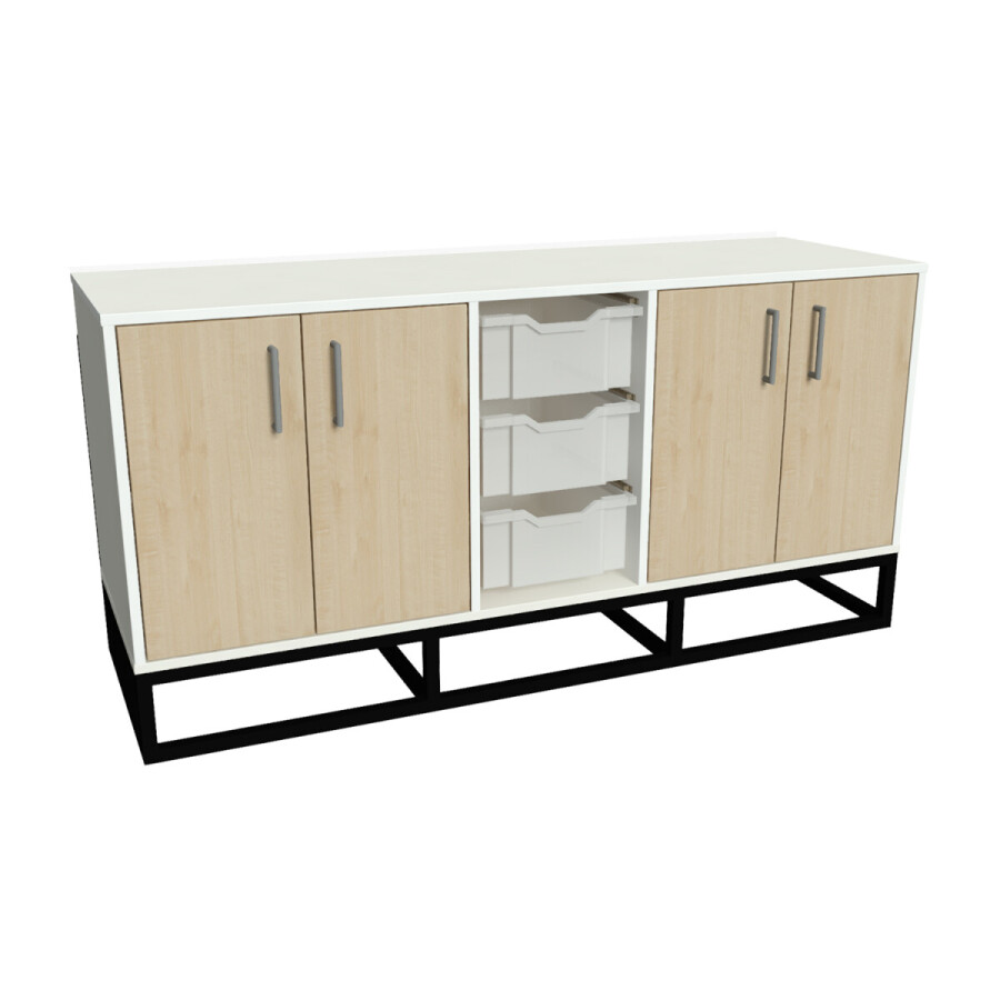 Kast Boris is een lage kast op een stoer ijzeren frame. Waardoor de kast een robuuste uitstraling heeft. Kast Boris is een lage ruimte verdeler. De kast is voorzien van kasten met legplanken en uitneembare schuifbakken. Kast Boris leent zich erg goed voor speelgoed, boekjes of andere spullen in op te bergen. Met de uitneembare bakken kan er overal in de ruimte gespeeld worden én makkelijk worden opgeruimd.