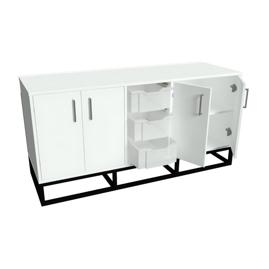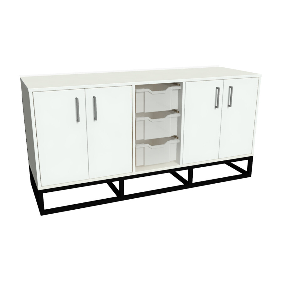 Kast Boris is een lage kast op een stoer ijzeren frame. Waardoor de kast een robuuste uitstraling heeft. Kast Boris is een lage ruimte verdeler. De kast is voorzien van kasten met legplanken en uitneembare schuifbakken. Kast Boris leent zich erg goed voor speelgoed, boekjes of andere spullen in op te bergen. Met de uitneembare bakken kan er overal in de ruimte gespeeld worden én makkelijk worden opgeruimd.