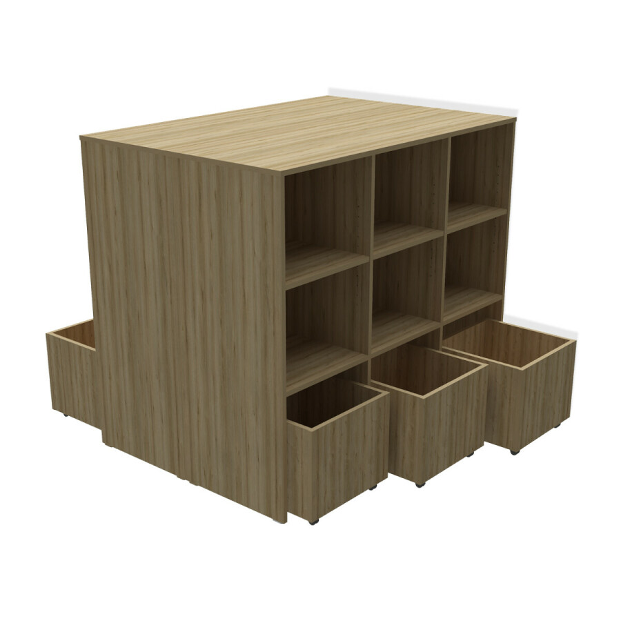 ⦁ Aan beide zijden komen aan de onderkant 3 rolbakken in de maat 38 x 38 cm met daarboven elk een vast schap en 1 verstelbare legplank.