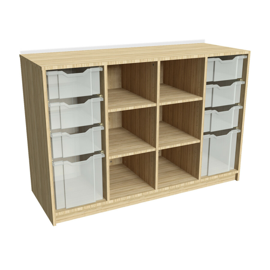 ⦁ De kieskast is aan beide zijkanten voorzien van 4 transparante kunststof symbox bakken; 1x Jumbo en 3x deep.
