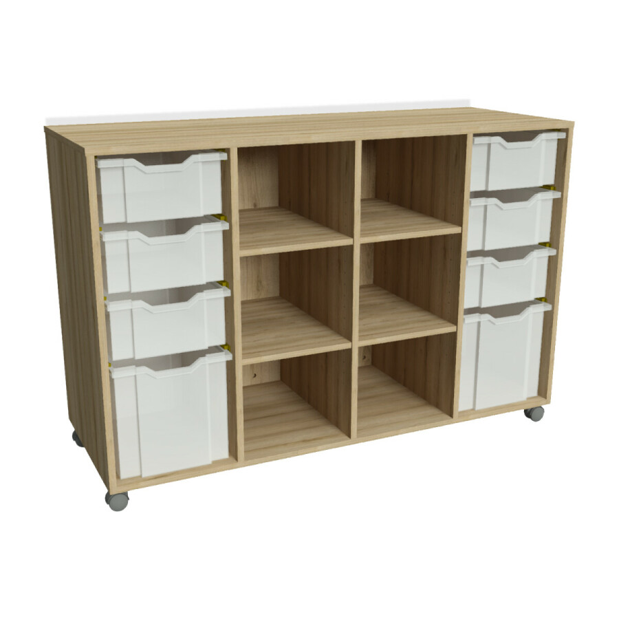 ⦁ De kieskast is aan beide zijkanten voorzien van 4 transparante kunststof symbox bakken; 1x Jumbo en 3x deep.