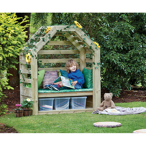 De leeshoek is voorzien van een dubbelzijdig zitkussen over de volledige lengte, met aan de ene zijde een grasprint en aan de andere zijde een boomschorsprint. Daarnaast worden vier bijpassende kussens meegeleverd in natuurlijke kleuren, allemaal voorzien van handvatten en eenvoudig schoon te maken. Onder het zitgedeelte bevinden zich drie handige opbergbakken met deksels, ideaal voor het opbergen van boeken en het stimuleren van zelfkeuze. Geschikt voor 2 tot 3 kinderen, afhankelijk van de leeftijd. De kussens en zitkussens zijn spatwaterdicht en daarmee perfect voor buitengebruik.