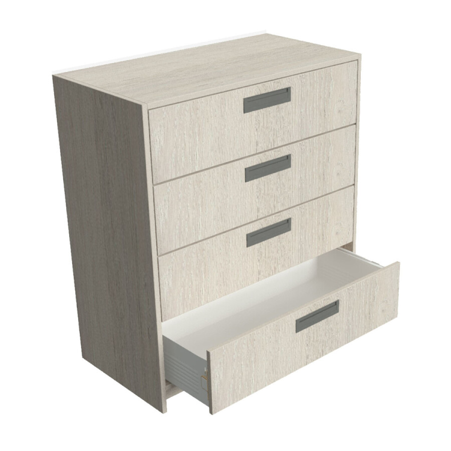 Module kast met lades is vervaardig van gemelamineerd MDF afgewerkt in de kleur: white wash. De kast is rondom afgewerkt met een pvc kantband in dezelfde kleur.