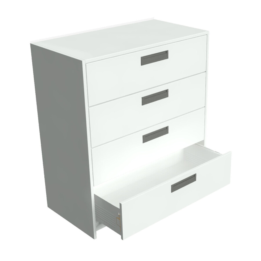 Module kast met lades is vervaardig van gemelamineerd MDF afgewerkt in de kleur: wit. De kast is rondom afgewerkt met een pvc kantband in dezelfde kleur.