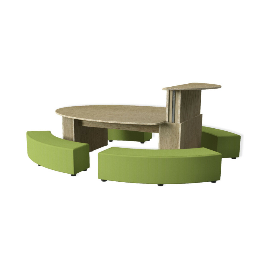 De Tafel Julia Hoog/Laag is een lage ovale tafel waarvan 1 deel is voorzien van een hoog/ laag systeem voor de leidsters zodat deze op een ergonomisch verantwoorde hoogte kunnen zitten.