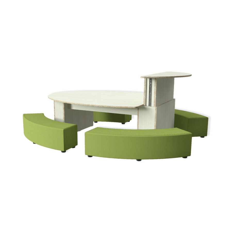 De Tafel Julia Hoog/Laag is een lage ovale tafel waarvan 1 deel is voorzien van een hoog/ laag systeem voor de leidsters zodat deze op een ergonomisch verantwoorde hoogte kunnen zitten.