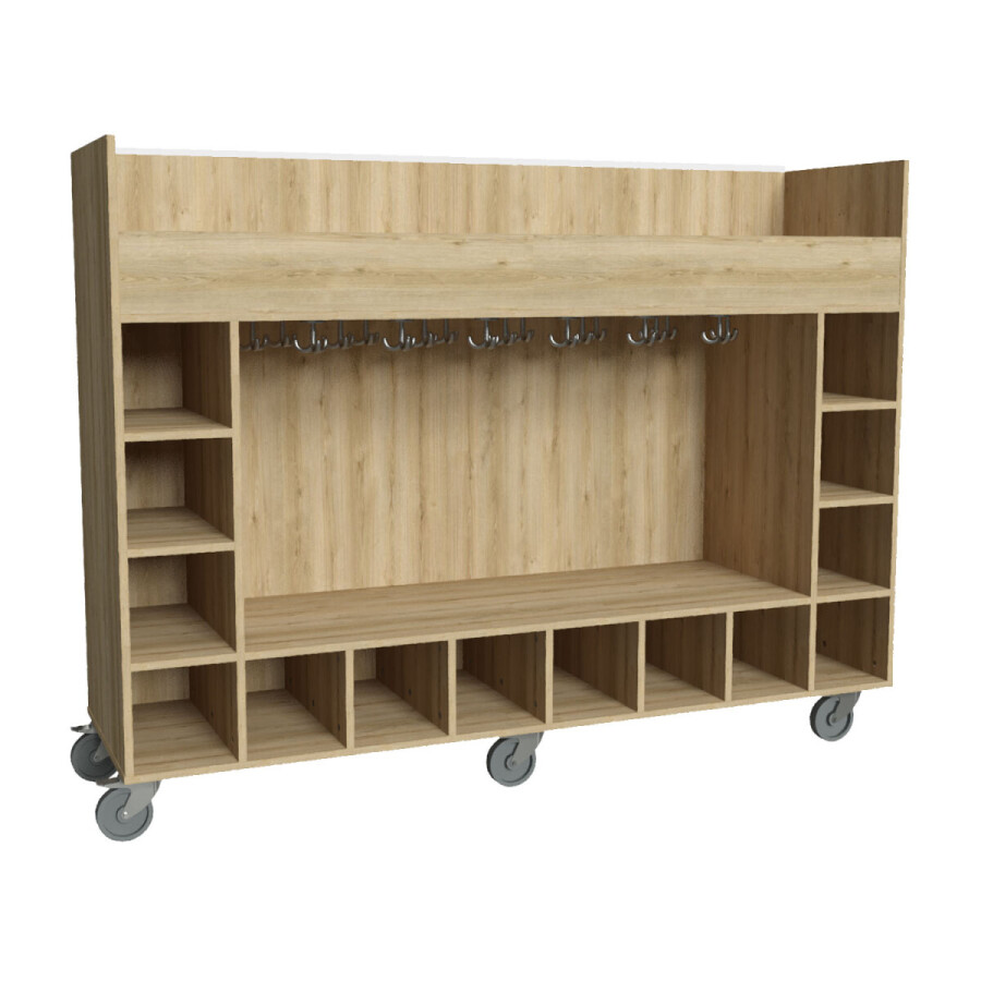 Iedereen houd van een opgeruimde ontvangst hal, met alle tassen en jassen van kinderen kan het al snel rommelig lijken. De verrijdbare garderobekast helpt bij het geordend per groep de jassen en tassen op te bergen. Door dat de garderobe verrijdbaar is, is deze ook makkelijk te verplaatsen en/of op te bergen. Naast de haken heeft de kast ook gelijke aantal openvakken, voor schoenen of andere spullen welke opgeborgen dienen te worden.
